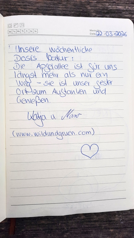 Liebe Freunde der Apfelallee,hier zeigen wir Euch die Einträge unseres Gästebuches, welches Ihr an der Sitzgruppe im Briefkasten finden könnt. Von Zeit zu Zeit fotografieren wir die Einträge und zeigen sie hier auf der Seite.Viel Spaß damit!